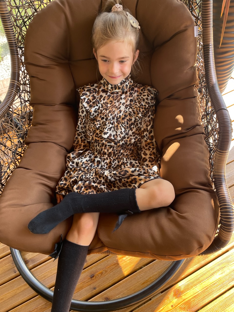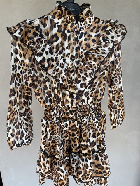 Tigro rašto rūbai užkariavę mados pasaulį! Puošni ir graži suknelė, sijonas dvigubo audinio, nugaroje kaklas segasi sagutėmis. Tie liemeniu suraukta juostelė.